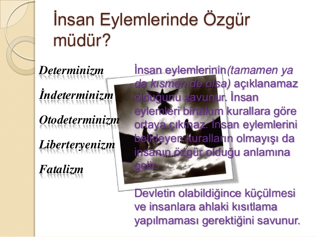 1. Yapmakta olduklaırmızdan başka bir şeyi yapmaya gücümüzün olmadığı görüşü. Buna göre, insanın ne geleceği ne de kendi eylemlerini belirlemeye asla gücü yetmez.