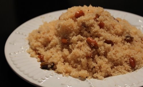 İrmik, tereyağ ve fıstıkları tencereye koyup, kısık ateşte yarım saat kadar irmiğin kokusu çıkıp, hem irmik, hem de fıstıklar iyice kavrulana kadar kavurun. İrmiğin fazla kavrulup, renginin kararmasına izin verilmemesi önemlidir.