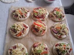 Daha sonra kenarda dinlenmekte olan pizza hamurundan küçük pizzalar hazırlayacaksanız cevizden biraz daha iri parçalar kopartın ve tezgâhın üzerine koyarak bir merdane kullanarak küçük tatlı tabağı büyüklüğünde açın. Açtığınız hamurların üstüne önceden hazırladığınız salçalı sostan bir kaşık kullanarak üzerinde hiç boşluk kalmayacak şekilde sürün. Sos sürülen minik pizzaların üstüne doğradığınız üst malzemeyi paylaştırıp yerleştirin. Bunların üzerine rendelenmiş kaşar peyniri serpiştirin. Hazırlanan pizzaları yağladığınız fırın tepsisine tek tek aralıklı olarak yerleştirin. Daha sonra önceden 195 derecede ısıttığınız fırına bu minik pizzaları fırına verip, üzerleri kızarıncaya kadar pişirip fırından çıkartın. Pizzalarınızı sıcak olarak servise sunabilirsiniz.