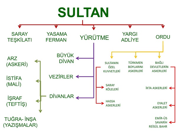 Hükümdar, töre ve müesseselerin tanıdığı haklarla devletin tek hakimidir. Yetkilerini ancak bazı töreler ve dinsel kurallar sınırlar ya da yönlendirirdi. Yönetimde hükümdar ailesinin önemli etkinliği ve etkisi bulunuyordu. Sultanın eşi, kardeşleri, oğulları ve ödiğer yakınları devlet yönetiminde söz sahibiydiler. Türklerdeki Hakan ya da Kağan, batıdaki imparator kelimesinin birebir karşılığıdır. Sultan, Türkçe adının yanında İslamî manada taşımaktadır. Sultan, merkezde otururdu ve ülke toprakları hanedan mensupları tarafından yönetilirdi. Merkeze bağlı beylik ve atabeglikler bulunuyordu. Bu atabeylikler devlet zayıfladığı zaman büyük bir tehlike oluşturuyordu. Sultanın hakim olduğu ülkelerde adına hutbe okunur ve para bastırılırdı. Fermanlara ve büyük dîvanın kararlarına sultanın imzası yerine tuğra çekilir, tevkiî yazılır ve kararlar ondan sonra yürürlüğe girerdi. Savaşlarda ve devlet ileri gelenleri ile yaptığı seyahatlerde, hakimiyet sembolü olarak, başının üstünde atlastan ya da altın sırmalı kadifeden yapılmış olan “çetr” yani hükümdar şemsiyesi tutulurdu. Çetre, sultanın ok ve yayından oluşturulan armaları işlenirdi. Sultanın diğer bir bağımsızlık işareti de, sarayın önünde günde beş kez nevbet çalınmasıydı. Hükümdar, kendisine yardımcı olarak bir vezir atar, zaman zaman da devlet ileri gelenlerinin katılacağı kurultayı toplardı.